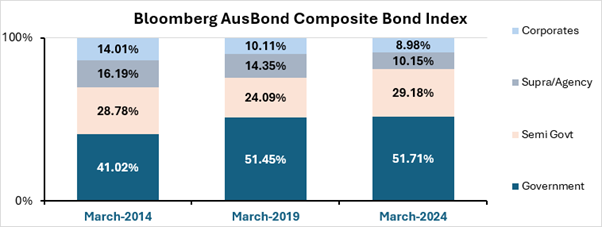 The composition of the Bloomberg AusBond Compositive Bond Index has changed significantly over the years, as the graph below shows.