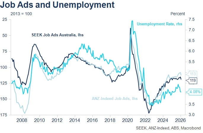 - The unemployment rate surprised to the downside in January, again printing at a very low 4.1%, when a slight retracement of the fall recorded in December was expected.